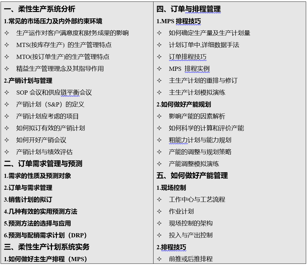 排以及工廠庫(kù)存是否合理控制等均直接反映出生產(chǎn)計(jì)劃管理水平的高低,同時(shí)生產(chǎn)管理的很多關(guān)鍵績(jī)效例如OTD(訂單準(zhǔn)時(shí)交付率)、生產(chǎn)能力的*大化應(yīng)用等在很大程度上取決于生產(chǎn)計(jì)劃體系的完善性和生產(chǎn)計(jì)劃制定的合理性。掌握正確的生產(chǎn)計(jì)劃管理思想和方法不僅僅是對(duì)生產(chǎn)計(jì)劃人員的基本要求,也是每一個(gè)生產(chǎn)管理人員必備的技能。