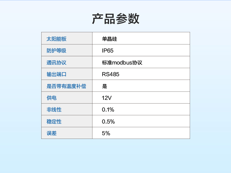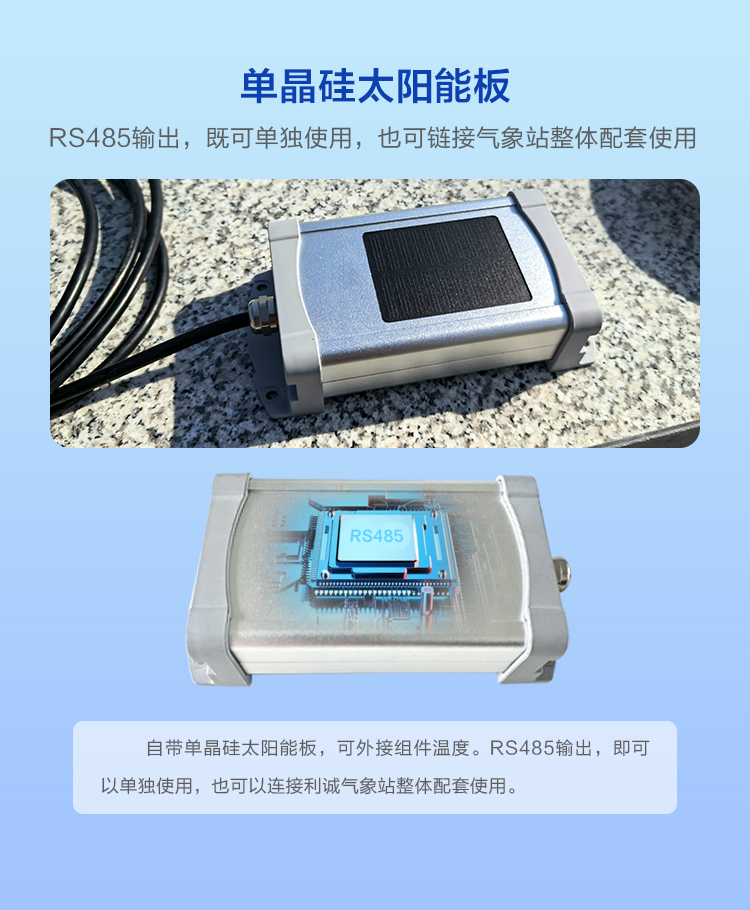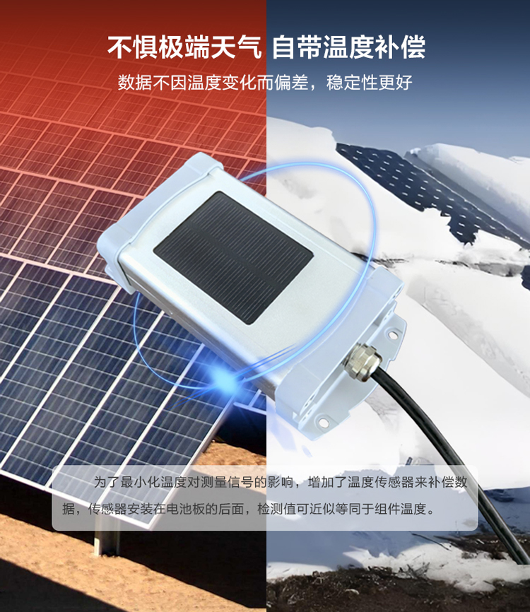 硅基輻照計(jì)是一款低成本、測量數(shù)據(jù)準(zhǔn)確的輻照度傳感器,可用于評估光伏發(fā)電系統(tǒng)效率。其傳感器的本身,采用硅基結(jié)構(gòu)與光伏組件的結(jié)構(gòu)相似,特別是它的光譜響應(yīng)以及傾斜誤差都與光伏組件極其相似,這讓使用硅基傳感器來精準(zhǔn)的分析光伏組件輻照度數(shù)據(jù)有據(jù)可循。