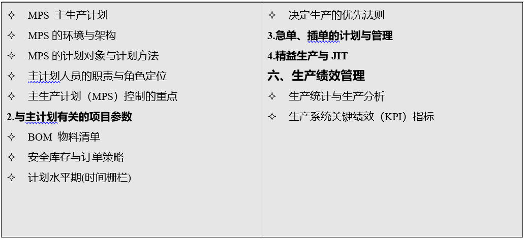 排以及工廠庫(kù)存是否合理控制等均直接反映出生產(chǎn)計(jì)劃管理水平的高低,同時(shí)生產(chǎn)管理的很多關(guān)鍵績(jī)效例如OTD(訂單準(zhǔn)時(shí)交付率)、生產(chǎn)能力的*大化應(yīng)用等在很大程度上取決于生產(chǎn)計(jì)劃體系的完善性和生產(chǎn)計(jì)劃制定的合理性。掌握正確的生產(chǎn)計(jì)劃管理思想和方法不僅僅是對(duì)生產(chǎn)計(jì)劃人員的基本要求,也是每一個(gè)生產(chǎn)管理人員必備的技能。