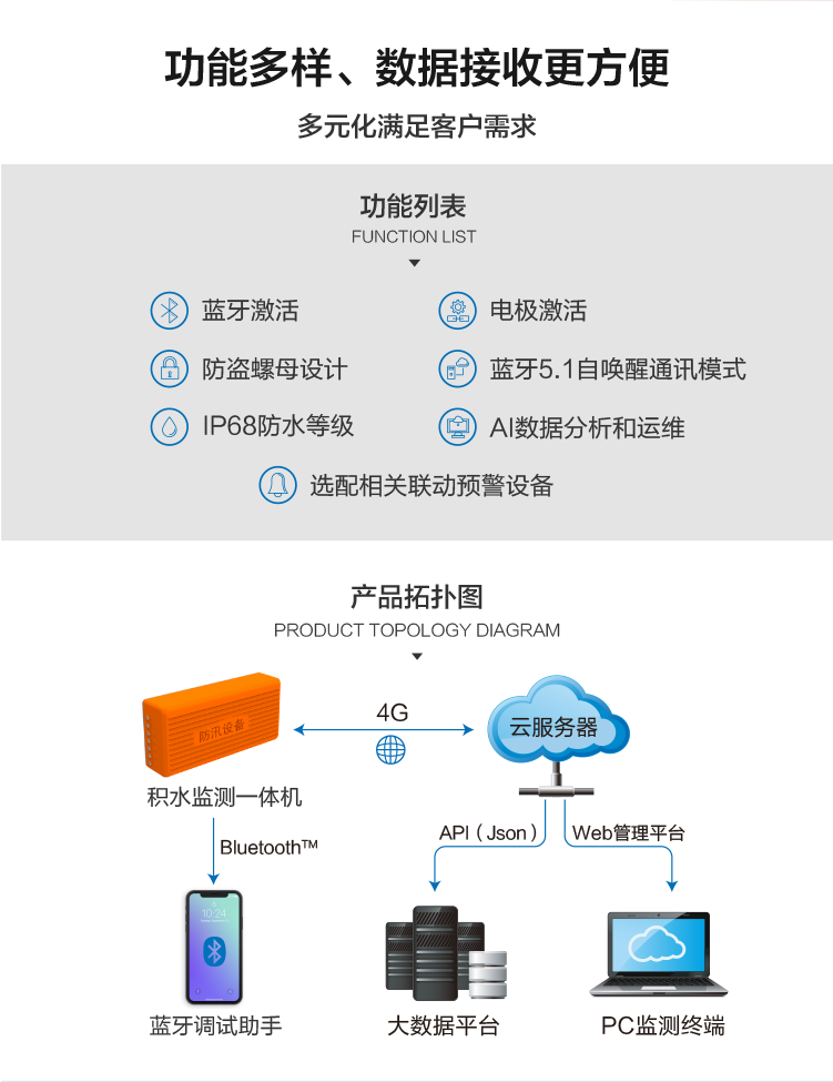 DC-JS31三合一積水監(jiān)測儀是一款針對城市道路、涵隧、下沉立交、地下車庫等安裝空間有限的場景開發(fā)的水位監(jiān)測設(shè)備。高度融合了多種微傳感、物聯(lián)網(wǎng)、移動互聯(lián)等先進(jìn)技術(shù),實(shí)現(xiàn)無需外部供電的情況下的積水探測、洪澇預(yù)警、遠(yuǎn)程控制等功能,具有體積小巧、安裝運(yùn)維便捷、響應(yīng)迅速、智能化程度高、延展性好等突出優(yōu)勢。