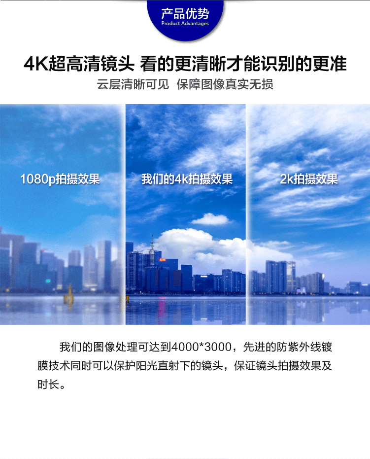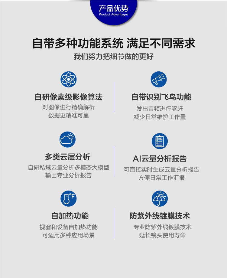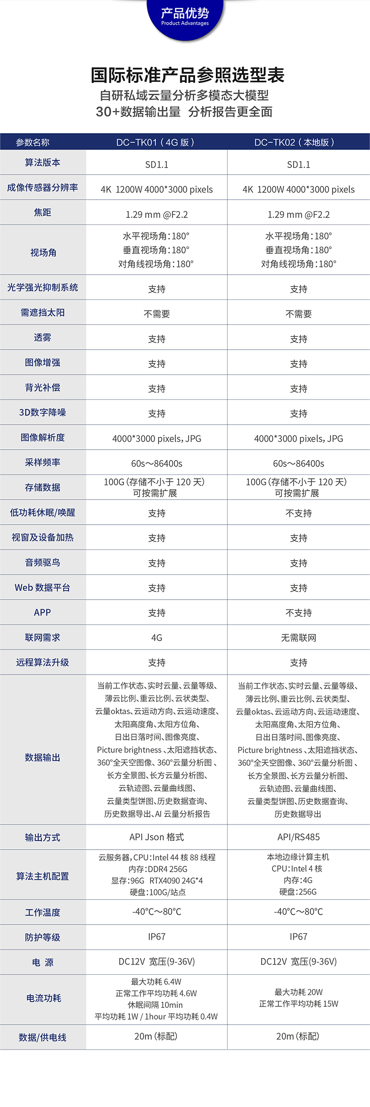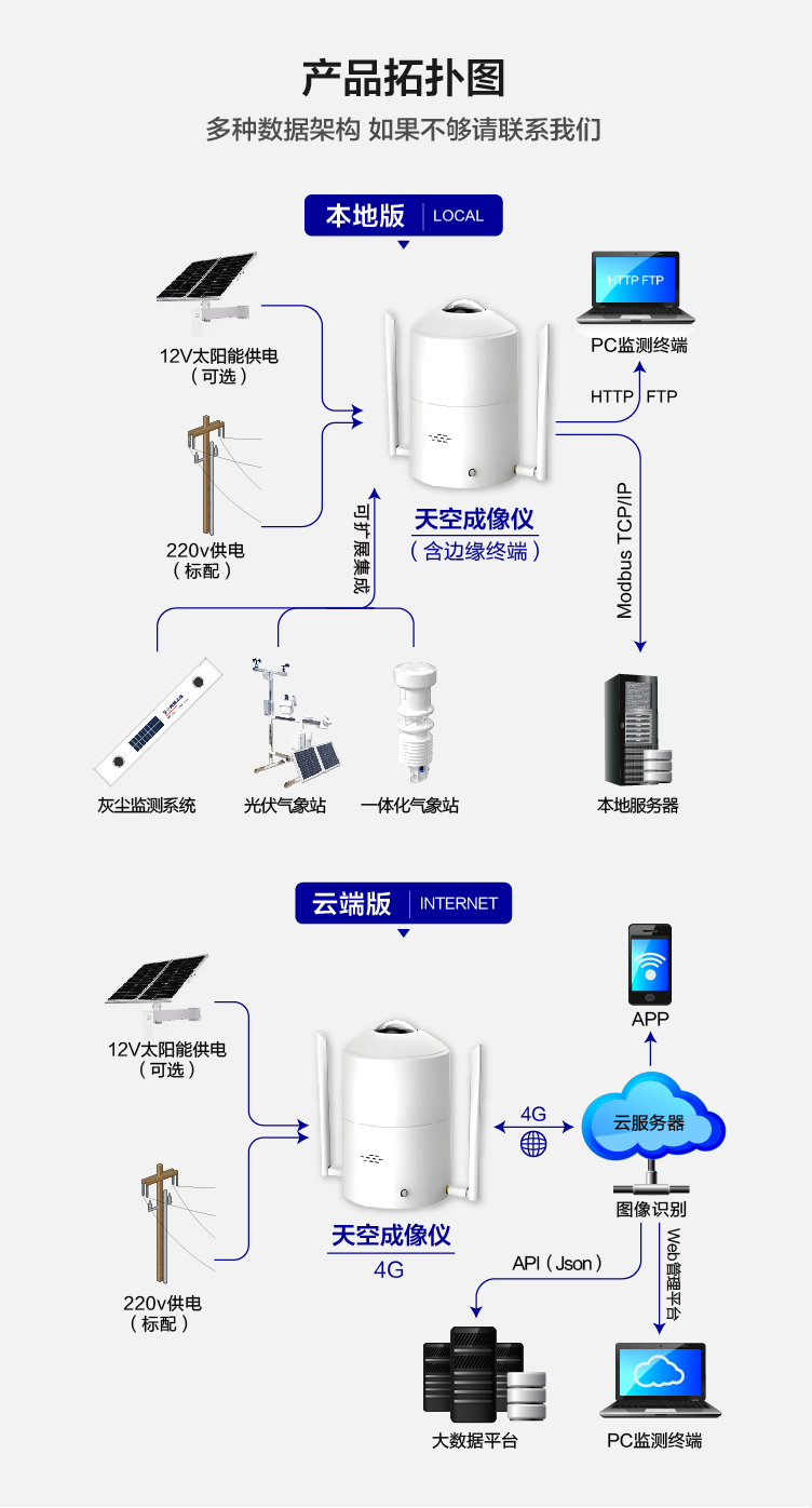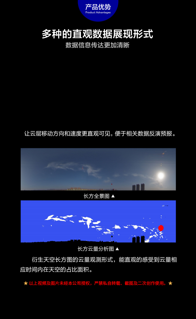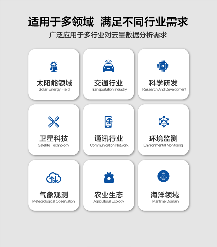 DC-TK系列全天空成像儀是一種用于監(jiān)測天空云量的儀器設備。它是由一系列的光學鏡頭、濾光片、光電傳感器以及視覺處理設備組成。全天空成像儀可以在無太陽遮擋而完全暴露在太陽光照之下清晰捕捉天空的圖像,并通過深度學習技術(shù)的云視覺算法分析天空圖像中的云量、云狀、云軌跡等參數(shù),可以用于,應用領域氣象觀測、環(huán)境監(jiān)測、氣候研究、天氣預報、太陽能評估及監(jiān)測、光功率預測、電站設計、農(nóng)林生態(tài)建筑設計及衛(wèi)星驗證等領域。