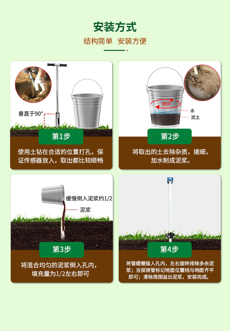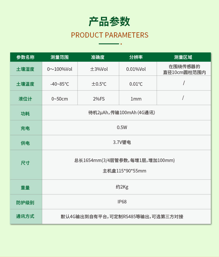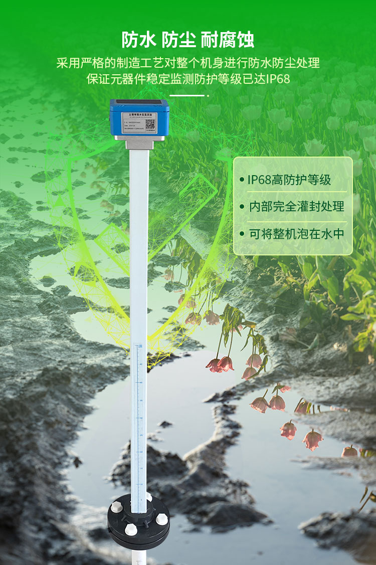 土壤墑情水位一體監(jiān)測(cè)儀,專為現(xiàn)代農(nóng)田、果園、溫室大棚及科研實(shí)驗(yàn)量身打造,精準(zhǔn)灌溉,降本增收,守護(hù)每一顆果實(shí)。進(jìn)口傳感器,地下部分準(zhǔn)確測(cè)量土壤中的水分含量和溫度,地上部分測(cè)量液位高度,確保數(shù)據(jù)的可靠性。2uA低功耗超長(zhǎng)續(xù)航,鋰電池加太陽(yáng)能充電系統(tǒng),滿配電池在陰雨天,可工作200天以上。IP68防水級(jí)材質(zhì),抗離子干擾,適應(yīng)復(fù)雜土壤環(huán)境。4G傳輸,支持PC端與手機(jī)APP雙平臺(tái)查看,及時(shí)干預(yù),科學(xué)種植。